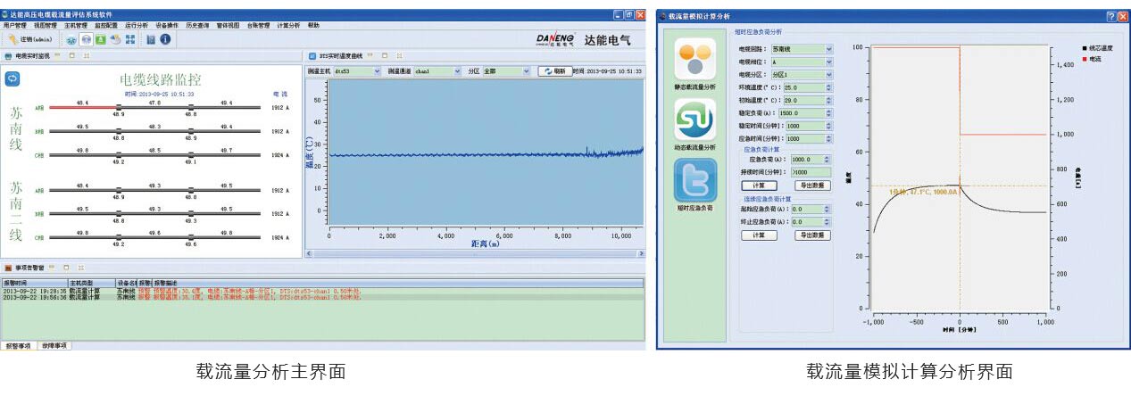 动态载流分析:根据导体温度以及实时负荷电流数据,给出未来许用电流的预测,或者预设电流的电缆安全运行时间;支持电缆隧道、自有空气、直埋、充沙等不同应用环境。