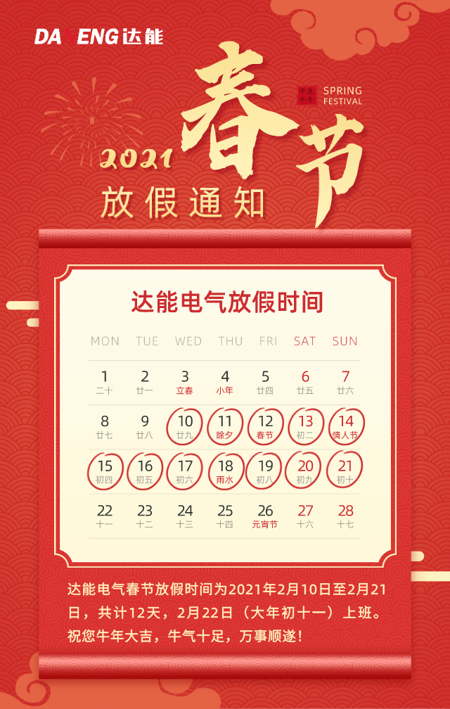春节的脚步越来越近,xingkong.com电气春节放假时间为2021年2月10日至2021年2月21日,共计12天,2月22日上班。春节临近,xingkong.com给您拜早年,祝您牛年大吉,牛气十足,万事顺遂!xingkong.com电气温馨提示:春节尽量避免境外旅游,减少大面积聚集,出行做好防护,安全愉快的度过新春佳节。